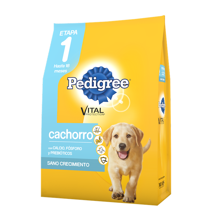 Pedigree® CACHORRO ETAPA 1 desde el destete (2 meses) hasta los 18 meses. Con calcio y prebióticos para un sano crecimiento y además cubre las 4 necesidades universales. SISTEMA INMUNE: contiene antioxidantes, como la vitamina E, que contribuye a mantener sus defensas saludables, fundamentales en esta etapa de su vida. SALUD ORAL: ayuda a la limpieza de sus dientes, a reducir la formación del sarro y a que sus encías estén más saludables. SISTEMA DIGESTIVO: Pedigree Cachorro está elaborado con ingredientes de la más alta calidad que facilitan el proceso digestivo, para que su pancita absorba lo mejor de su comida. PIEL Y PELO: La piel es la primera barrera de defensa que tiene tu cachorro por eso la fórmula de Pedigree Cachorro contiene Omega 6 y Zinc para nutrir su piel, protegiéndolo más efectivamente de agresiones externas, y que su pelo esté más brilloso.