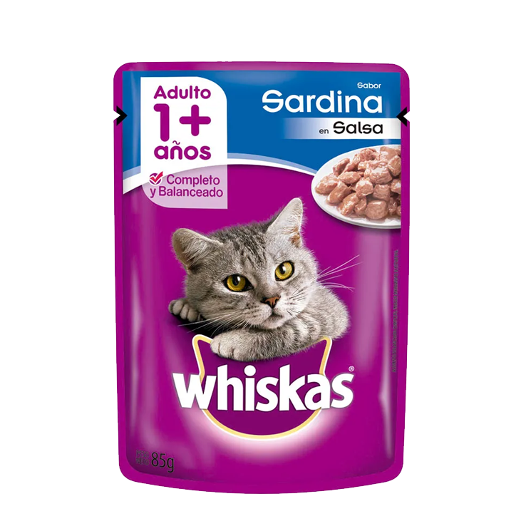 Whiskas en sobrecitos Adulto sabor sardina en SALSA es un alimento húmedo nutricionalmente completo y balanceado. Son trocitos de carne cocidos al vapor en una deliciosa salsa. Su fórmula contiene proteínas de alta calidad proporcionando los nutrientes que ellos necesitan todos los días, manteniéndolos siempre saludables. Desarrollados con un 80% de agua en su composición aportan 1/3 de las necesidades hídricas de un gato al día. Esto ayuda a prevenir las enfermedades de tracto urinario que se originan por el stress y falta de ingesta diaria de agua (algo normal en los gatos debido a su origen desértico).